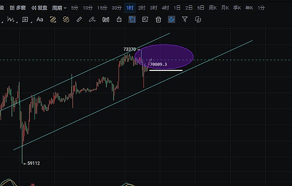 回踩70800-71500附近分批开多,目标72800-74000附近