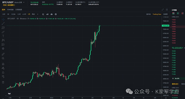 BTC目前的行情走势短线级别上是在触及并去站稳72000位置,按照目前裸K技术上面的解析,量能不断地在加强,行情一直进行突破,如果单方面的走势量能以及行情来看,今年十万美金一枚是必然会达到的,主要看的一个区间是在10-12万区间值,那么现在的支撑点位我们要防守的几个位置大家注意:68000-70000是目前有效的支撑点位,因为现在整体的价格上比较高,所以波动就会大,几千美金或者说万点的插针表现属于目前价格比较正常的,上方目前的阻力位置按照目前的百分比进行计算,首先要关注的点位在76000-80000区间值,只有突破并去站稳80000这个关口之后,直接可以看到10-12万区间,这个位置预防腰斩行情的出现即可。