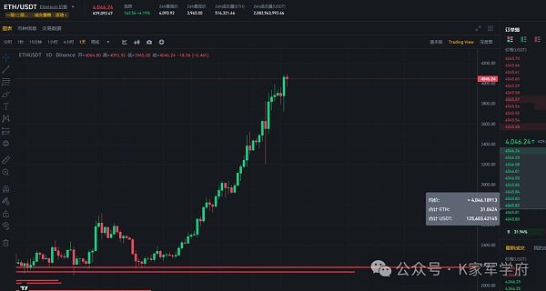 ETH现在的行情阶段,按照目前的走势个人的一些看点可以关注,目前的日线级别走势是很明显的一个单边上涨的行情,中间会有插针行情是正常的波动,按照目前的行情价格比较高的情况下,有这样的走势插针必定是插合约爆仓的,因为只有把多军杠杆爆仓之后才会继续能上冲更高点位置,那么现在4000点的行情作为目前的一个节点位置,还是多次进行试探,只有彻底站稳4000点一线的位置,后续的行情会达到一个短线的高点区间4200-4500区间一线,下一步就是需要去站稳4500点一线达到历史新高,之后才可以去看到6000或者更高的位置,今年我们的目标是7500-10000区间一线,按照目前级别上的走势,我们可以关注短线级别的支撑点位在3800点一线,这是目前短线级别的有效支撑位置,触及这个位置可以开始进场,如果你没有持仓ETH,可以按照3800开始接单,100美金为一个距离位置进场,可以挂单到3300点一线位置