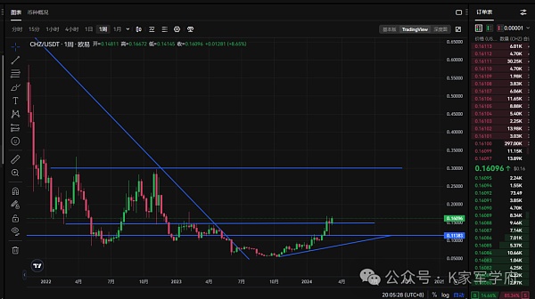 首先CHZ是一个龙头币,也是一个平台币,还记得前年提前埋伏,做了几波收益都是不错,这个币也是在去年下旬的时候一直在提醒埋伏,来看看目前的升值空间,按照目前的价格0.16,至少今年我觉得是可以稍微破下前高点的,也就是0.3以上,去年一直提醒大家埋伏的价格在0.07的底部,到现在也有一倍多,那么按照目前周线级别的底部来讲,上方空间至少看一倍,站稳0.3之后上方的空间会再次的放大,直接可以看到0.5-0.6区间值