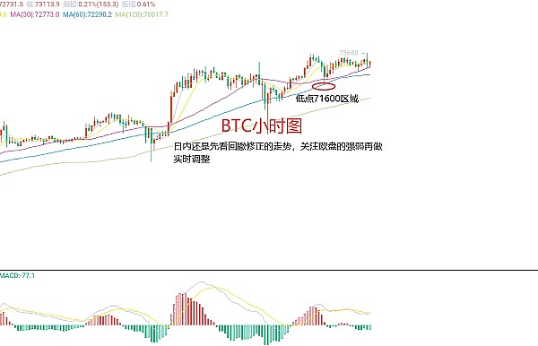 昨日交易方面收获还是非常不错的,上午策略现价给出BTC和ETH72000区域和4020区域多单,接近欧盘时间分别止盈于73000区域和4070区域,跟上的朋友吃肉。有一点跟大家讲一下,近期的行情价格每天波动还是比较大的,所以大家资金太小了就不要去着急操作了,仓位没办法安排,即使盈利也看不到什么利润,还有亏损的风险,怎么算都是划不来的,所以大家要注意我说的这一点,虽说当前机会是很好的,但也是需要资金基础的,不要信那些什么不需要成本,无本起家之内的话,那都是洗脑的,哪有天上掉馅饼的事情呢!