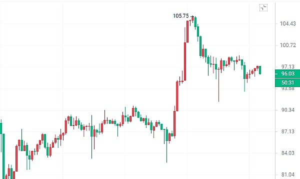 那么今日行情可以看到大盘已经进入了EMA均线内开始走弱,目前一直在EMA30之上徘徊,MACD缩量增加,KDJ向下交替成型了以后,有向上收口的可能,布林带收口已经成趋势,短期内会再次冲击布林带中轨压力位97附近,上方关注103压力点