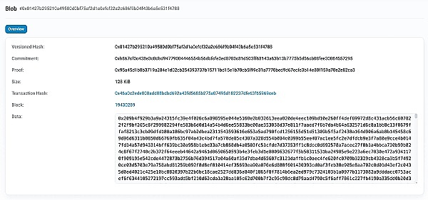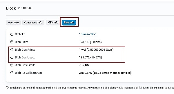 我们在具体来看看 Blob 在以太坊上的体现,我们在比较新的一个区块 19430289 中,可以看到有 Blob 相关信息,128 kiB 对应 1 个 blobs,Gas Price 只有 1 wei。