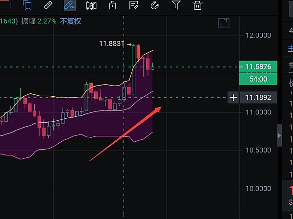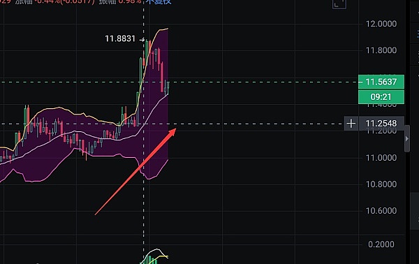波卡继上个文章中有说道破位11.40就要向上看空间,目前虽然有回调,那么整体思路就要以低多为主,4小时布林带还是呈上行趋势,可以考虑在11.00-10.95区间布局多,进场需带好止盈止损,见好就收!