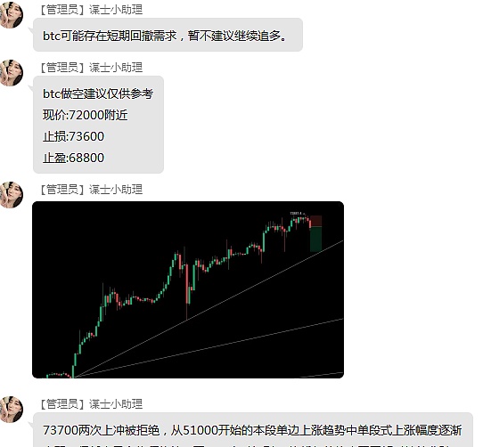 卖出点二:73047.16 USDT(03月14日20:00的最高价,如果市场继续看涨,则该点位是更高的卖出目标做空止损点:73528.11 USDT(超过03月14日16:00的最高价,若价格突破该阻力位,做空策略应考虑止损)