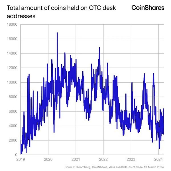 目前的供需数据差了10倍。这导致了最近几周比特币价格大幅上涨,因为新开采的比特币供应远远跟不上需求,导致 ETF 发行人不得不从二级市场采购。数据显示 OTC 市场持有的BTC自2020年的峰值以来已经下降超过 70%,可能是 ETF的需求将OTC的流动性买干涸了。
