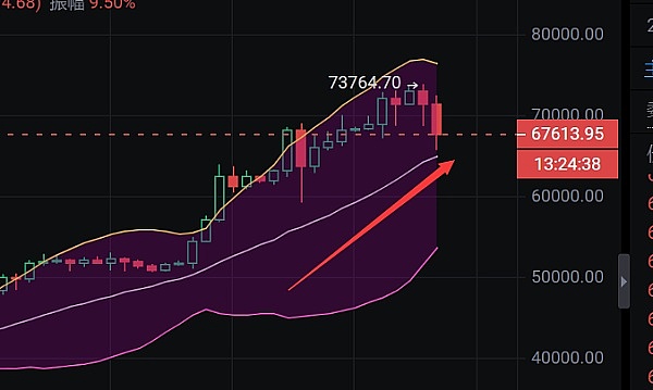 比特币早间行情出现大滑落,一度跌到66000下方。12小时线已经破位中轨线,币价持续低迷,晚间可关注69100-69500区间;再看日线级别布林带依旧是上行趋势,币价也在中轨上方,那么就要考虑中轨支撑65000能否破位!操作点位上方69100-69500区间不破轻空;下方65000-65500区间不破做多!行情瞬息万变,请带好止盈止损,见好就收!