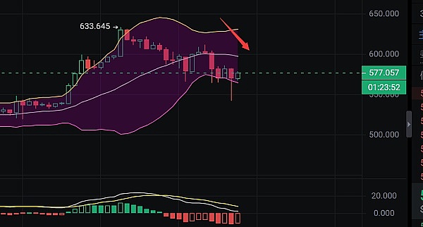 BNB下行的价格比预期的好,在2小时线布林带下轨呈反弹趋势,建议在560-570区间布局多,可看到597-605区间破位可继续持有!