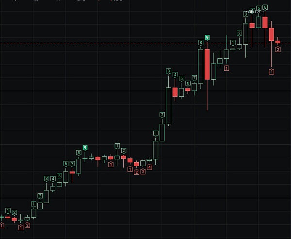 日线在连续拉升幅度减小的情况下,出现了需求衰竭,昨日虽然是长下引阴K,但也算一个吞没结构,所以今日小幅反弹到72000附近后延续下跌。虽然两连阴,但回踩幅度是整轮上涨的23.6,是一个良性的回调