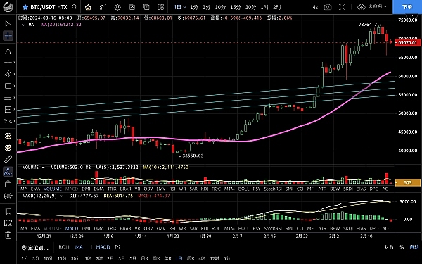 大饼昨日跌幅较大,最低至65600一线支撑,随后行情走出v型反弹,最高触及70630一线受阻,恭喜跟上思路的朋友多单获利四千点,目前币价在69000附近运行,四小时级别行情未能跌破6w5关口,说明多头趋势依然存在,macd空头缩量双线走平,短期行情止跌,但反弹力度也不算太大,整体处于ma60和90均线之间震荡,日线连阴回落,macd高位死叉,虽指标偏向空头但目前来看再破前低的概率不大,周末以震荡为主,震荡后会再次试探下方支撑,然后蓄力去上攻突破新高,之后走出深度回踩,但不是牛市结束,思路依旧是低吸为主,上方压制70500-71500,下方支撑68300-67500