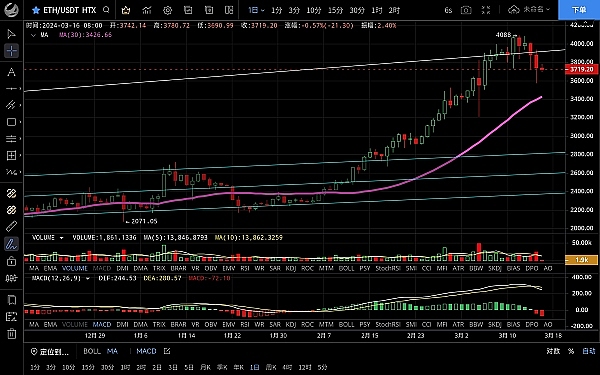 以太坊受大盘影响也走出一波大幅度下跌,最低至3570一线支撑反弹,恭喜跟上昨日思路的朋友多单获利二百点,目前币价在3720附近运行,四小时级别行情震荡回落后受ma120均线支撑止跌反弹,且二次下探未破前低,空头逐步缩量双线聚拢,短期行情止跌走震荡修复,波动不大,日线级别连阴附图指标死叉运行,整体走势较弱,周末原因没什么太大行情,后市以太坊走向还是很看好的,加上以太坊的现货etf若通过了,未来肯定不可估量,思路不变依旧是低多持有,上方压制3800-3900,下方支撑3640-3560