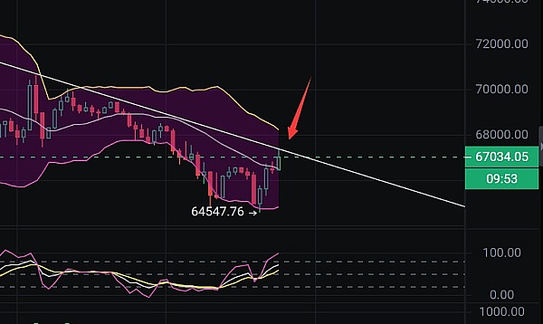 比特币行情如预料再次滑跌至65000下方。1小时线来看反弹至中轨上方,EMA15指标向上,目前币价处于EMA30处,MACD持续增量,说明币价还有一定小区间;EAM60与EMA280形成死叉,那么短期的话还是会有较大的下调!晚间还是继续看67300-67500区间不破接空即可!