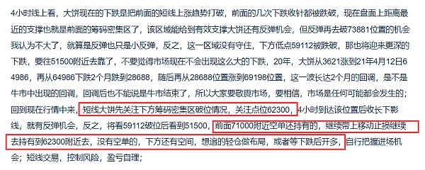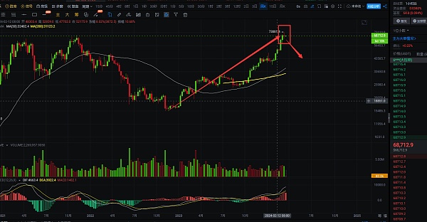 周线上看,大饼目前周线出现做空信号,拉升到历史高位后收一根顶部十字星,这样的收线大家都应该知道属于是空头强势,也就是出现了做空的信号,虽然现在市场还是做多情绪浓重,但从上周的盘面表现上来说,上涨上方已经遇到了一定的阻力,就算是处于牛市中的行情,也会有回调,昨日已经提到21年的那一波回调,这一波大饼开始回调的点位预计也很有可能会比较深,但是回调比较深并不代表牛市就已经结束,只能说正常回调,预计回调点位在44700-37800,这个回调也不是一两天走出来的,或许要经历3-4个月的时间走出,大家只是心理做好一个预期,行情只有走出来才知道结果,大饼目前继续持续拉升好像是到了瓶颈期,想要破10万,还需要更多资金进来,这波很有机会下跌吸筹后在开始走拉升,虽然比特币减半是属于利好,但现在行情已经涨了这么多,利好也能算是提前走出预期,真正到了减半时间,就没有那么大的涨幅了,这是本周以及后市的一些个人见解,希望对大家有所帮助;白盘上,大饼短线交易做好高空,推荐点位69500附近,目标看62300附近,自行把握进场机会;短线交易,控制风险,盈亏自理;
