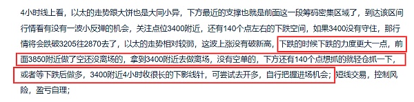 周线上看,以太是没有破历史高点4877位置,以太到达压力4050附近就没有去走继续反弹,周线收阴,打破了前面6连阳的走势,说明4050压力目前是有效的,大饼也高位收十字星,后市以太也开始走反弹的机会很大,预计回调点位在2100-1580,大家心里做好一定的预期,以太上涨的力度是没有大饼强的,但是下跌起来可能就不会输大饼,本周以及后面的几个月时间,以太预计也会跟大饼差不多开始走下跌,大家做个交易参考;短线上,以太保持高空思路交易,推荐点位3725附近,目标先看3400,再看 下方破位,自行把握进场机会;短线交易,控制风险,盈亏自理;
