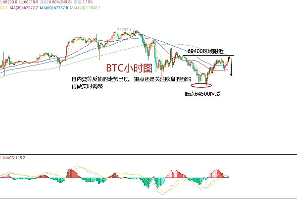 3月18日比特币(BTC)合约技术面分析:今日方面,大周期日线级别昨日报收小阳线,K线形态连阴单阳,价格在均线下方,附图指标死叉向下运行,当前价格还是有回撤的需求的,低点位置64400区域附近,高点均线阻力位置69700区域附近,这是今日关注的价格区间点位;短周期小时图昨日欧盘时间价格慢涨反弹,美盘延续确没有破高,凌晨价格承压回撤,今日早间支撑反弹,当前在试探凌晨高点阻力位置,那么日内就不要着急了,还是等反弹承压后再进场了,因此今日BTC短线合约交易策略:反抽69400区域空, 止损69750区域,目标看68600-68400区域;