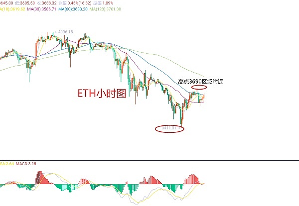 3月18日以太坊(ETH)合约技术面分析:今日方面,大周期日线级别昨日报收小阳线,K线形态连阴单阳,价格在均线下方,附图指标死叉向下运行,在大趋势上当前是处于回撤的走势当中,上方均线阻力位置3690区域附近,低点支撑位置3410区域附近,这是本周需要关注的区间点位,大概率会走此区间震荡;短周期小时图昨日欧盘价格上涨,美盘延续,凌晨盘整后今日早间承压回撤,高点3685区域,低点3410区域附近,当前价格支撑反弹,K线形态连阳,日内还是有反抽的力度,但大趋势当前回撤种,所以今日要等反抽承压后进场,因此今日ETH短线合约交易策略:反抽3665区域空,止损3691区域,目标看3600-3580区域