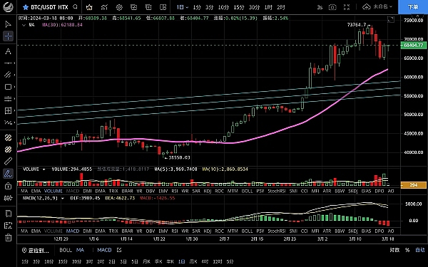 大饼昨日再破前低至64550一线支撑,随后行情反弹一路上行,最高触及68900一线受阻回落,恭喜跟上低多思路的朋友获利近四千点,目前币价在68000附近运行,四小时级别行情反弹受阻但回落力度不大,macd多头运行双线金叉状态,ma7有拐头向上的迹象,目前行情走势缓慢,处于横盘震荡阶段,下方关注67500支撑情况不破则会再次反弹,日线级别以倒锤子收线,可见多头守住了65000支撑,虽指标偏向空头,但下跌力度暂缓,预计再次下跌的概率不大,若日线能站稳69000则有继续上行的机会,预计震荡调整后有再次上攻的动能,思路依旧围绕低多为主高空为辅,上方压制69000-70500,下方支撑67500-66000