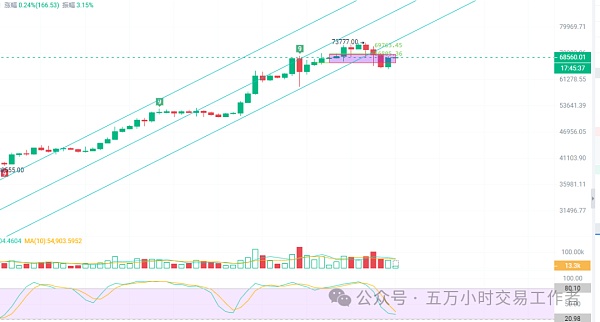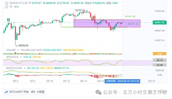 下面我们来看一下四小时级别行情,上方我们关注69763美元这个位置在ma60均线附近位置,下方关注ma120均线位置也就是66477附近