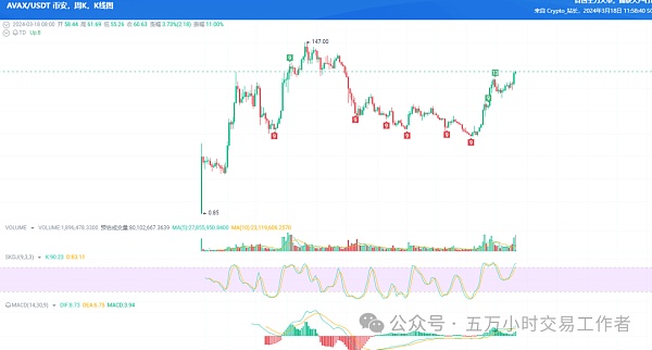 AVAX现价60.5分批买入现货总仓位的20%即可,留补仓位置。再有就是下次解锁时间还有两个多月,只是占供应量的1.34%,而且周线即将放量 ,24小时净流出1.83亿美元,24小时成交29.7亿美元,其中主力净流出1379.24万美元,主力减仓0.464%由此可见主力卖出情况一般,现货周期比较长这个可以拿半个月到一个月时间,预期涨幅60%