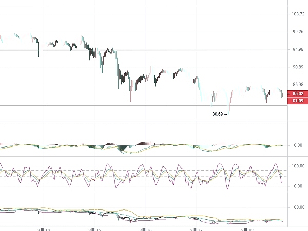 四小时目前的趋势处于横盘阶段,涨跌幅度不大,K线目前一直在EMA均线下方,预计会连续试探均线压力位,MACD缩量结束开始放量上行,DIF和DEA金叉成型,加上布林带收口以后,底部支撑关注82附近,思路上建议低多为主,下方第一入场点关注82.5,上方压力位关注86.8,具体操作以实时策略为主,建议仅供参考,风险自担