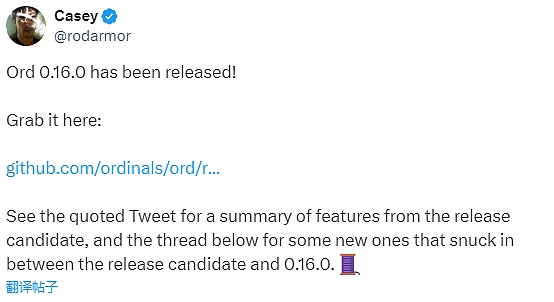 1、Ordinals 和 Runes 协议创始人 Casey 发布了 Ord 0.16.0 版本。