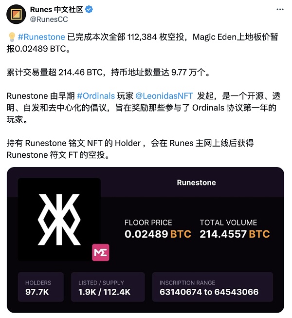 2024年3月16日,空投完成;112385个子铭文使 Runestone 成为历史上最大的父子铭文合集;