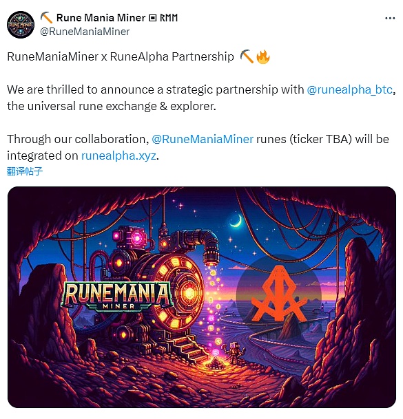 2024年3月14日 Rune Mania Miner 官宣了 RuneManiaMiner x RuneAlpha 合作。