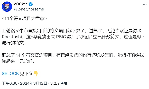 2024年3月12日,c00k1e 发文汇总了 14 个符文概念项目,包括: