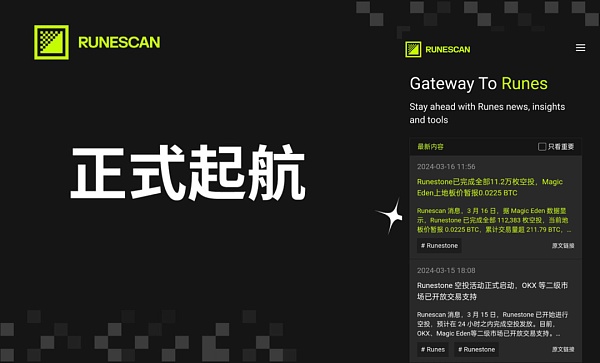 2024年3月17日,Runescan 正式起航!感谢社区伙伴的支持和建议!快讯功能首先亮相,助力大家把握先机。
