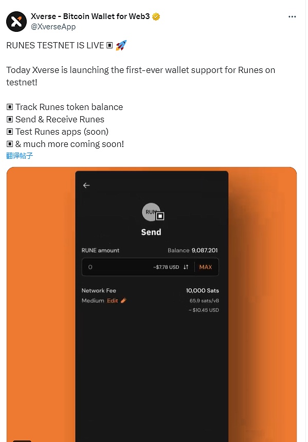 2024年3月14日 Xverse 发文 RUNES 测试网已上线 ▣ ,Xverse 在测试网上推出了首个对 Runes 的钱包支持!