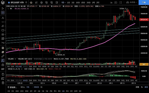 大饼昨日白盘最高触及68900一线后受阻,随后行情震荡回落,早间开盘一路下跌,目前价格在65000附近运行,四小时级别打破震荡区间,k线大阴回落,macd多头转空双线死叉,短期暂未止跌,走势偏向空头,有试探前低的风险,若四小时线未跌破预计会走一波反弹,关注反弹力度若收长下影,则行情企稳,反之会再次下跌破位前低,日线级别来看上方阻力较强未能站上69000上方,行情走势偏向回撤,若64250-63250给到机会可以分批买入,61500加仓买看新高,目前依旧是牛市,所以依旧是低吸为主,上方压制66600-67500,下方支撑64500-63700