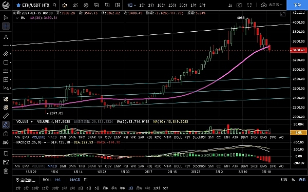 以太坊走势与大盘一致,整体呈震荡回落走势,最低跌至3362一线支撑反弹,目前币价在3420附近运行,四小时级别行情大阴回落跌至ma200均线支撑,短期暂时止跌,macd空头运行双线死叉,ma7向下指引,走势来看还有下行的风险,若ma200能撑住预计会走一波反弹,日线级别来看行情连阴回落跌破30日均线,空头逐步放量死叉向下运行,整体走势偏弱,若再次回踩,给到3320-3230机会可以分批买入,拿好低位筹码,以太坊未来一定不可估量,思路依然是低多为主,上方压制3470-3550,下方支撑3320-3230