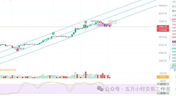 下探目标位置关注61150-59500美元区间,上方反弹的话目标参考69500美元附近,极限反弹71400美元