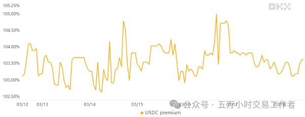 过去一周 USDC 溢价一直高于 3%,表明该稳定币的交易价格高于其挂钩汇率。最值得注意的是,即使在最近的 3 月 17 日价格调整至 64533 美元的情况下,这一溢价也没有低于其公允价值。