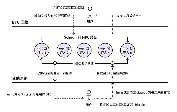 Schnorr 和 MPC 验证人结合的签名方式保证跨链操作的去中心化;