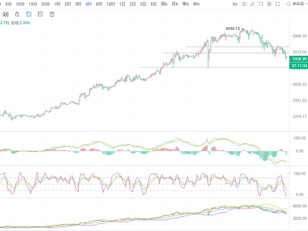 四小时K线目前盘口的短线趋势依旧是空势,思路上支撑破了以后建议顺势空,不要逆势抢单,盘口卖方成交量增加,市场恐慌程度可能会增加,当心出现踩踏现象,K线以跌破了EMA均线目前并没有回到趋势线内,空头短期内比较强势,加上短线趋势MACD缩量下行以后,DIF和DEA向下开始交叉,KDJ也向下交叉,
