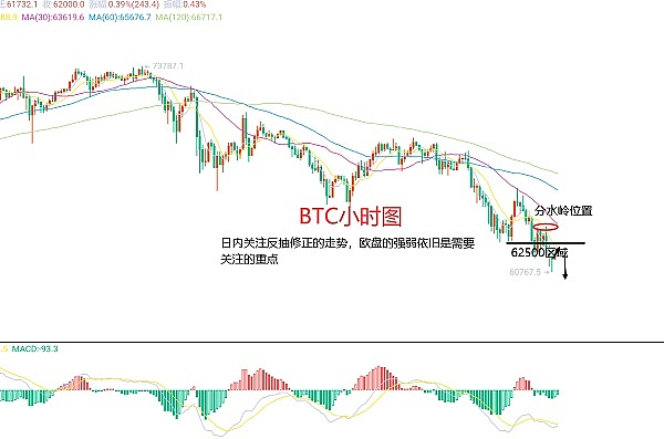 3月20日比特币(BTC)合约技术面分析:今日方面,大周期日线级别昨日报收中阴线,K线形态连阴下跌,价格持续向下破低,附图指标死叉向下放量运行,这样来说当前的回撤走势还在持续当中,那么这个时候多单大家就不要轻易去博取了,顺势才是王道,另外,在做空的同时也要注意反抽的风险问题;短周期小时图昨日欧盘下跌破前一日低点,凌晨反抽修正今日早间二次承压回撤下跌,当前价格探底后支撑反弹,日内还是要走修正的走势,但今日看延续下跌的话,价格反抽不能破分水岭位置,因此今日BTC短线合约交易策略:反抽62500区域空,止损62850区域,目标看61500-61300区域;