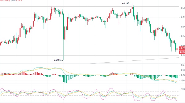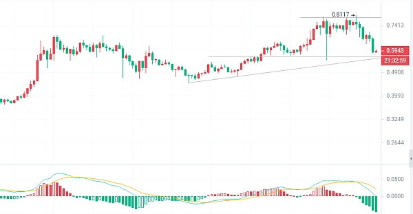 日K线预计下探寻求站立点,重点关注EMA120这个位置的支撑,卖方较为强劲,MACD缩量下行以后,DIF和DEA有可能过0轴,那么早起的背离有可能就此结束,短线可以低多为主,下方第一支撑点0.55附近,