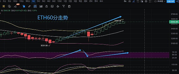 以太坊60分走势,几个K线当前多头排列与布林带上轨下方,受制与上方3595一线压力!RSI趋势线,在70值上方趋势线钝化走平,上方压力位较强。后续能否继续走高还需当前3595附近的有效突破。