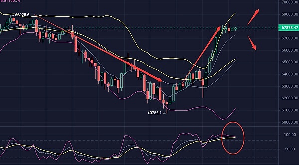 比特币行情昨天有给到下方关注61800-61500区间破位情况,破位就要考虑60000关口,果然币价在60756处触底反弹,如文章提示到守住就会形成反弹;当前行情在73000上方,1小时指标来看价格正在持续回落,MACD能量削弱;KDJ交叉向下发散;价格正在向下接近EAM180,破位后可持续关注EMA15和EMA120交叉处;4小时可关注EMA15和EMA120交叉支撑位,破位就考虑在EMA180处了;综合上述指标操作建议高空为主:67300上方可空,目标66790与66180和65300这三个点;行情瞬息万变,请谨慎操作,见好就收!