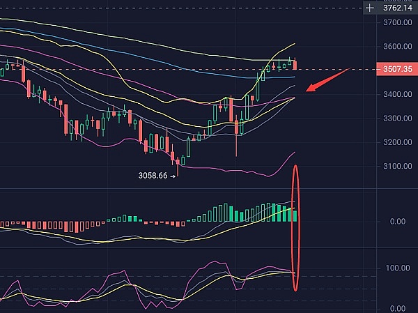 以太坊整体走势比大盘稍微要弱势点;1小时来看价格已经在EMA180处徘徊;EMA60与EMA30和布林带三点交叉形成支撑;综合上述指标来看建议高空为主,多单考虑底部不破即可进场;3500上方空,目标3475与3440和3390这三个点;行情瞬息万变,请谨慎操作,见好就收!