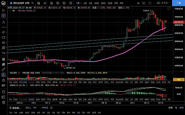 大饼昨日最低触及60760一线止跌,随后行情开始反弹一路上行,最高至68210一线受阻,恭喜跟上低多思路的朋友获利七千点,目前币价在67330附近运行,四小时来看6w关口得以支撑走出v型反弹,k线五连阳收复失地,上方受ma90均线压制受阻,短期走出回落,预计力度不会太大,macd多头运行双线金叉,ma7拐头向上指引,短期走势来看偏向多头,日线收线在ma30上方且二次回踩未破前低,行情企稳反弹,上方关注短期69000阻力突破则继续上行至前高附近,低位筹码继续持仓,坚持才会迎来胜利,牛市还会继续,思路仍是以低多为主,上方压制69000-70500,下方支撑66000-64500