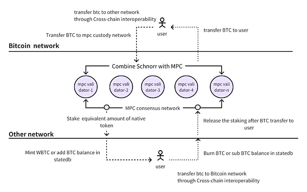 与上面类似,Dapplink Bitcoin 生态跨链互操作协议可以实现 Bitcoin 到 Bitcoin-Layer2 和 EVM 链之间的跨链互操作。自从比特币主网进行 Taproot 升级之后,通过 Schnorr 签名技术来构造 m-n 的多签 Taproot 账户成为了可能。我们认为,Schnorr 和 MPC 验证人结合的签名方式可以保证跨链操作的去中心化,同时,MPC 验证人质押也可以防止验证人作恶。