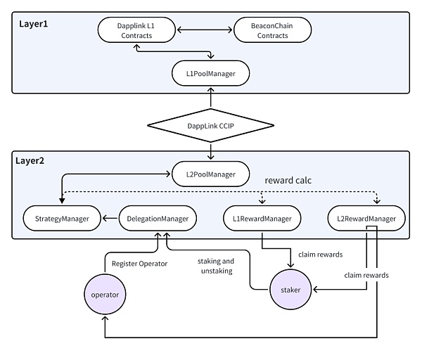 staker 质押在 Layer1 上的 ETH/WETH 将会通过 DappLink 跨链互操作协议转到一层质押给信标链节点,而staker 将获得双重收益:Layer3 AppChain 网络交易执行奖励和来源于信标链的质押收益。