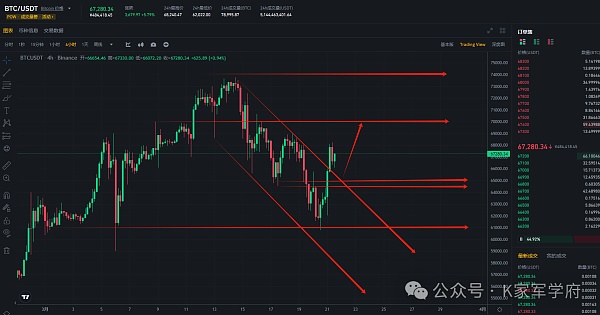 从目前的四小时级别上明确的看出四小时级别已经走出小级别的下行通道,那么按照整体上来看70000的关口属于目前短线级别的阻力点位,也是后续需要关注的一个关键节点位置,后续突破并去站稳70000的关口点才能去打开更大的空间值,按照目前四小时级别的短线周期来看64000-65000属于目前阶段的支撑点位,个人理解给出建议:只要达到64000-65000区间可以直接看涨反弹,上方只要站稳70000的关键点位,那么可以直接再次的去看前期历史新高,按照预计先看第一目标点位:74000前高,第二目标点位76000-80000区间一线