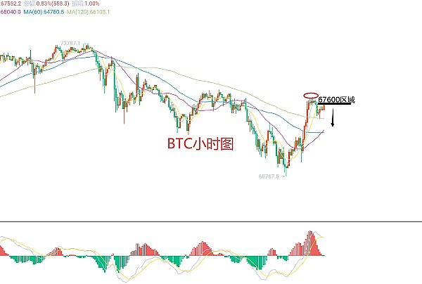 3月21日比特币(BTC)合约技术面分析:今日方面,大周期日线级别昨日报收中阳,K线形态上还是连阴单阳,但昨日的反抽力度是比较大的,基本抹平了前一日跌幅,从整体走势来看当前还是处于弱势走势的,其中也不排除大区间震荡的存在,所以交易还是要注意风险;短周期小时图凌晨上涨破前一日高点位置,早间没有延续,当前价格在低位,附图指标快慢线粘合有死叉迹象,那么日内还是有下跌的需求的,需要注意的是欧盘能否出现反抽破高的走势,因此今日BTC短线合约交易策略:现价67600区域直接空,止损68000区域,目标看66600-66300区域;