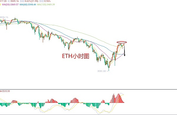 3月21日以太坊(ETH)合约技术面分析:今日方面,大周期日线级别昨日报收中阳线,K线形态连阴单阳,价格在均线下方,附图指标死叉向下运行,大趋势上还是明显弱势的,即使昨日出现了较大的反抽行情,而价格也是抹平了前一日的跌幅幅度,但趋势并没有改变;短周期小时图凌晨价格上涨破高,早间没有延续,当前处于高位盘整,而附图指标多头缩量快慢线有粘合死叉迹象,那么这样来看日内大概率还是要下跌的,就看力度了,因此今日ETH短线合约交易策略:现价3540区域直接空,止损3570区域,目标看3460-3440区域