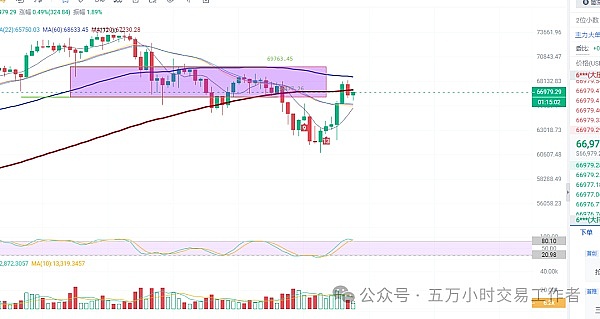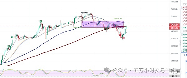这个是今天早晨我们说的行情,也是在四小时收线之后直接击穿我们早上说的第一支撑位直接跌到66072美元开始反弹,目前我们还是以四小时为例,上方反弹至我们早上所说的67193美元又给打了回来,另外从skdj和交易量指标来看四小时级别我个人还是倾向回调的,因为这个skdj已经是在80以上开始转向,小时级别下方还是关注66093美元,四小时级别关注65500美元,上方关注阻力位置68500美元的强压位