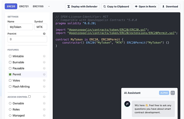 在 OpenZeppelin 上,对几个常用的 token 发行合约进行了模块化的展示,我们可以直接在其中选择功能,然后直接跳转到 Remix。