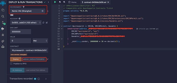 随后我对这个发行 token 的合约进行了设置,使用 Wyz Research 的全名,Wyz 的缩写,并且选择了功能里的预发行,并且对合约进行了控制所有权的指定。通过这些操作,右侧的合约代码中,多了第一个红框中显示的建造者,而预发行的代币也有了地址指向。